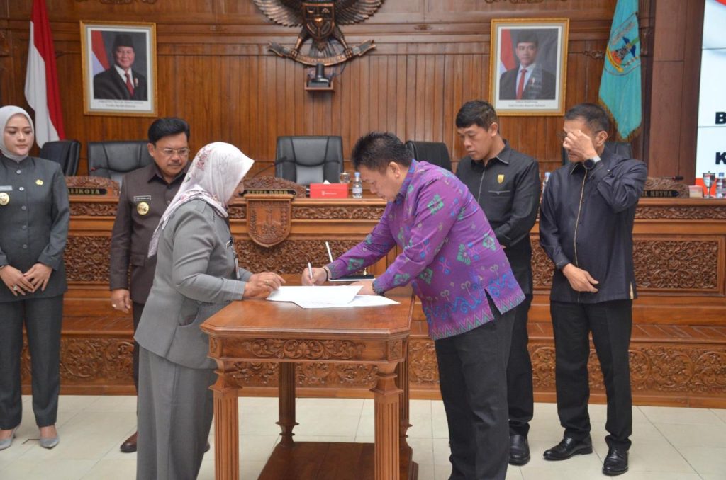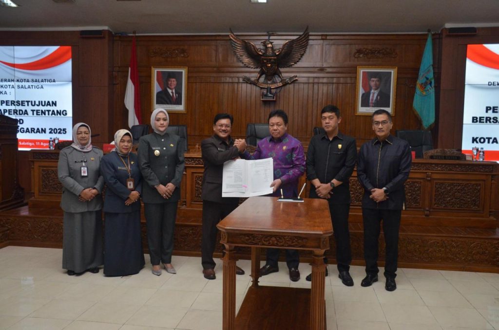 Wali Kota Salatiga, dr. Robby Hernawan, Sp.OG. bersama Wakil Wali Kota Salatiga, Nina Agustin, menghadiri Rapat Paripurna DPRD Kota Salatiga dalam rangka Penandatanganan Persetujuan Bersama Wali Kota Salatiga dan DPRD Kota Salatiga tentang Rancangan Peraturan Daerah Tentang Perubahan APBD Tahun Anggaran 2025. Rapat Paripurna digelar di Ruang Bhinneka Tunggal Ika Kantor DPRD, Senin (11/08/2025).